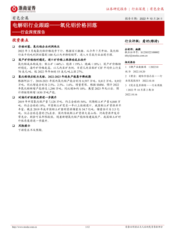 【浙商证券】【20221024】电解铝行业跟踪:氧化铝价格回落-12页 行业研究