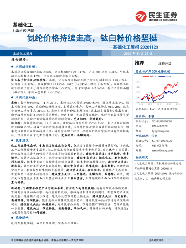 【民生证券】【20201123】基础化工周报:氨纶价格持续走高,钛白粉价格坚挺-18页 行业研究