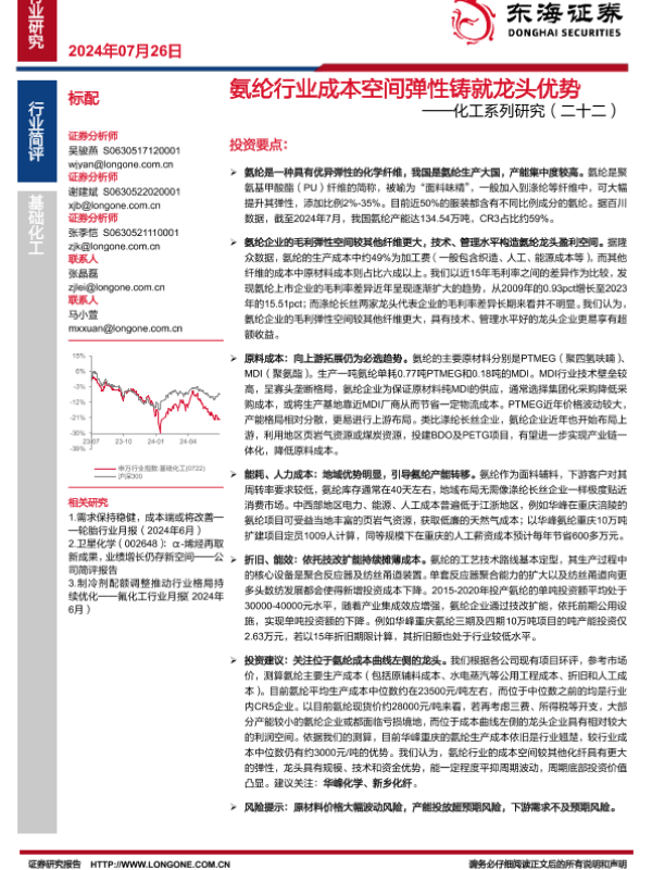 【东海证券】【20240726】氨纶行业成本空间弹性铸就龙头优势-12页 行业研究
