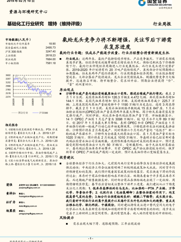 【国金证券】【20190210】基础化工行业研究周报:氨纶龙头竞争力将不断增强,关注节后下游需求复苏进度-37页 行业研究