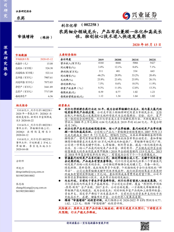 【兴业证券】【20200513】20200513-兴业证券-利尔化学-002258.SZ-农药细分领域龙头,产品布局兼顾一体化和高成长性,独创核心技术进入快速发展期-34页 行业研究