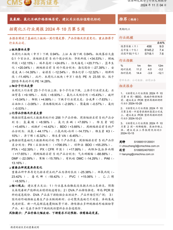【海通证券】【20241104】招商化工行业周报2024年10月第5周:氢氟酸、氯化亚砜价格涨幅居前,建议关注低估值绩优标的-16页 行业研究