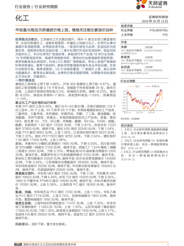 【天风证券】【20190513】20190513-天风证券-化工行业研究周报:甲烷氯化物及天然橡胶价格上涨,继续关注维生素涨价品种-17页 行业研究