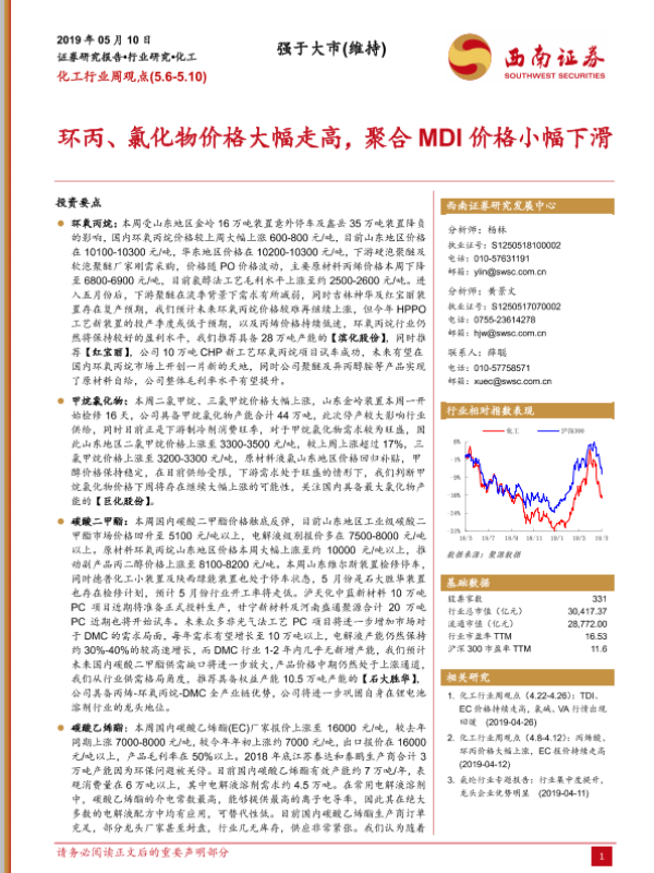 【西南证券】【20190510】20190510-西南证券-化工行业周观点:环丙、氯化物价格大幅走高,聚合MDI价格小幅下滑-4页 行业研究