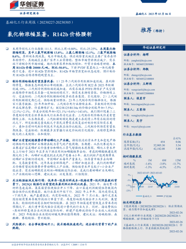 【华创证券】【20230306】基础化工行业周报:氯化物涨幅显著,R142b价格腰斩-62页 行业研究