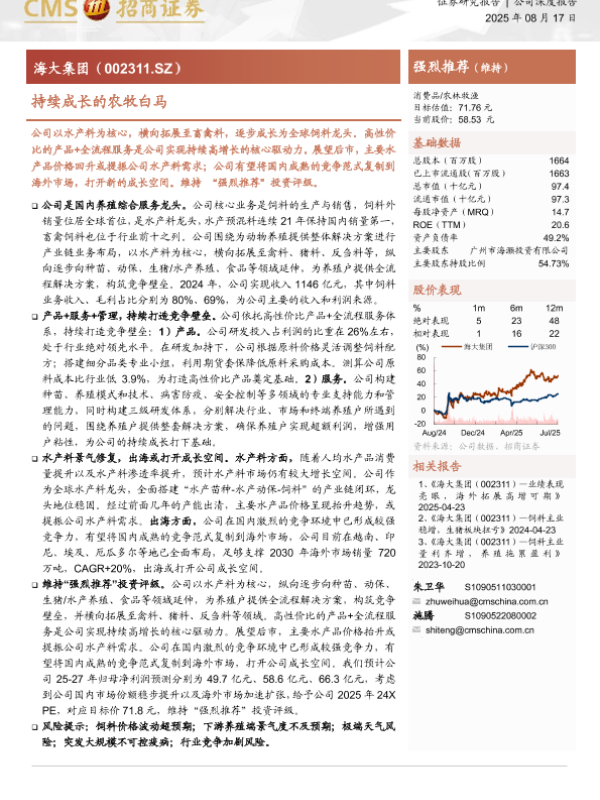 【海大集团(002311.SZ)招商证券】【20250817】海大集团(002311.SZ)-持续成长的农牧白马-27页 证券期货研究报告