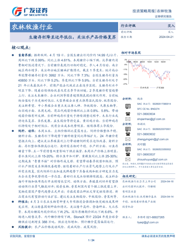 【广发证券】【20240421】农林牧渔行业:生猪存栏降至近年低位,关注水产品价格复苏-24页 行业研究