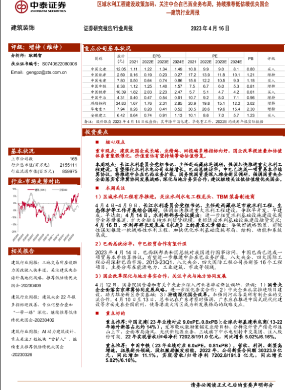 【中泰证券】【20230416】建筑行业周报:区域水利工程建设政策加码、关注中企在巴西业务布局,持续推荐低估绩优央国企-27页 行业研究
