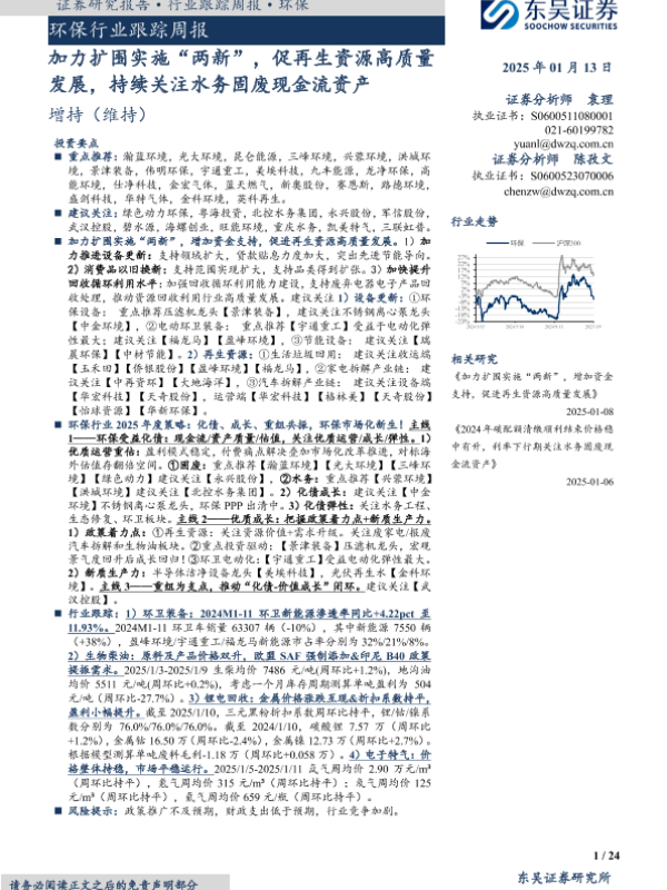 【东吴证券】【20250113】环保行业跟踪周报:加力扩围实施“两新”,促再生资源高质量发展,持续关注水务固废现金流资产-24页 行业研究