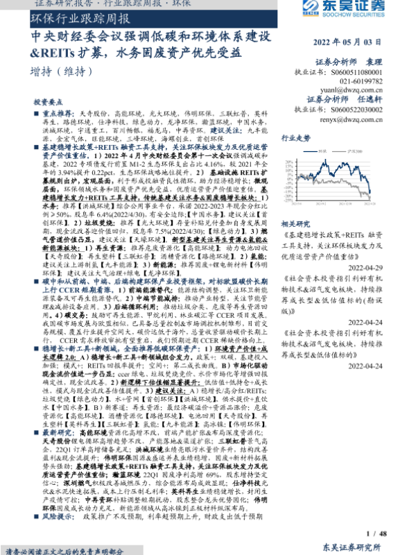 【东吴证券】【20220503】环保行业跟踪周报:中央财经委会议强调低碳和环境体系建设&REITs扩募,水务固废资产优先受益-48页 行业研究