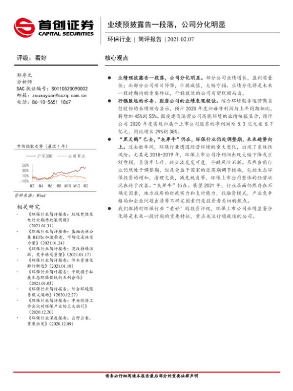【首创证券】【20210207】环保行业简评报告:业绩预披露告一段落,公司分化明显-7页 行业研究