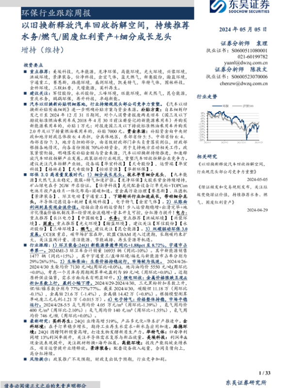 【东吴证券】【20240505】环保行业跟踪周报:以旧换新释放汽车回收拆解空间,持续推荐水务/燃气/固废红利资产+细分成长龙头-33页 行业研究