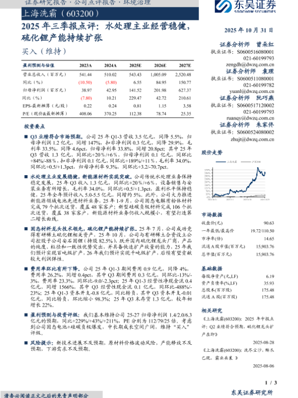 【东吴证券】【202510】2025年三季报点评:水处理主业经营稳健,硫化锂产能持续扩张-3页 证券期货研究报告