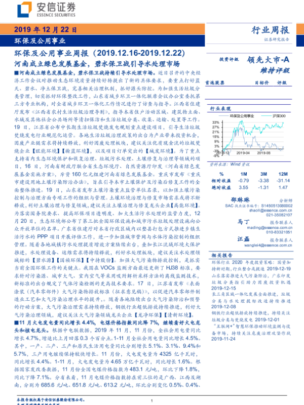 【安信证券】【20191222】环保及公用事业周报:河南成立绿色发展基金,碧水保卫战引导水处理市场-17页 行业研究