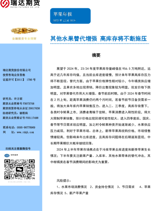 【瑞达期货】【20231220】苹果年报:其他水果替代增强 高库存将不断施压-16页 行业研究