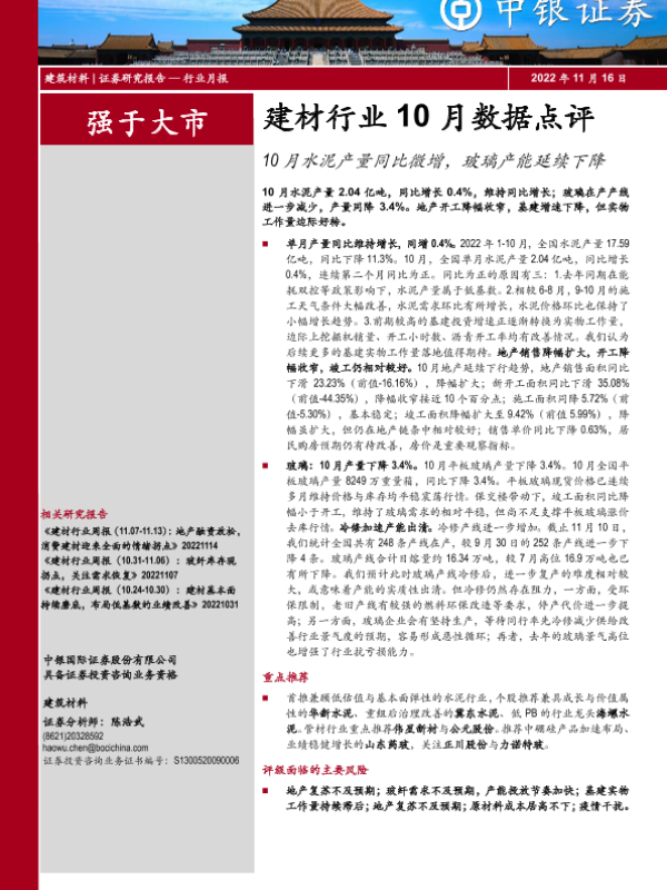 【中银证券】【20221116】10月水泥产量同比微增,玻璃产能延续下降-11页 行业研究