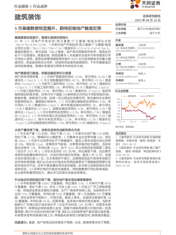 【天风证券】【20220616】建筑装饰行业点评:5月基建数据明显提升,期待后续地产触底反弹-4页 行业研究