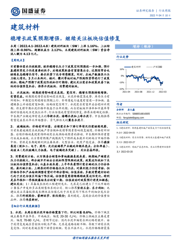 【国盛证券】【20220410】建筑材料行业周报:稳增长政策预期增强,继续关注板块估值修复-11页 行业研究