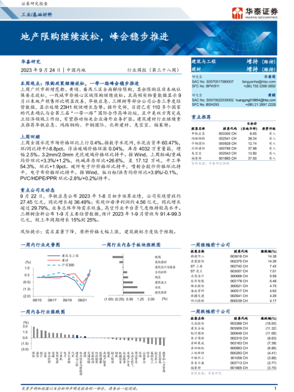 【华泰证券】【20230924】工业基础材料行业周报:地产限购继续放松,峰会稳步推进-15页 行业研究