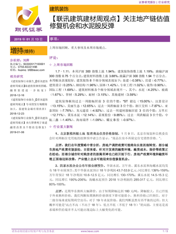 【粤开证券】【20190113】联讯建筑建材周观点:关注地产链估值修复机会和水泥股反弹-9页 行业研究