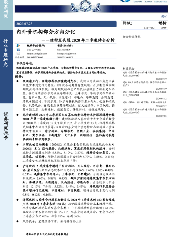 【国泰君安证券】【20200723】建材龙头股2020年二季度持仓分析:内外资机构部分方向分化-8页 行业研究