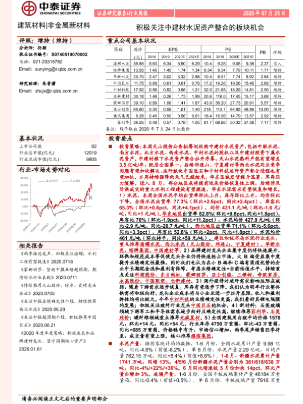 【广发证券】【20200726】建筑材料行业投资策略周报:中国建材拟启动水泥资产重组,关注出梅后赶工需求-21页 行业研究