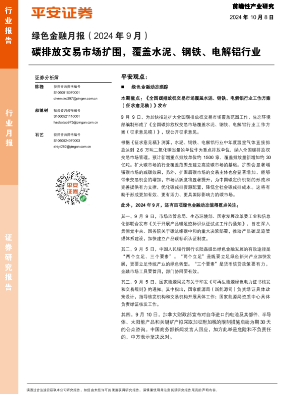 【平安证券】【20241008】绿色金融月报(2024年9月):碳排放交易市场扩围,覆盖水泥、钢铁、电解铝行业-13页 行业研究
