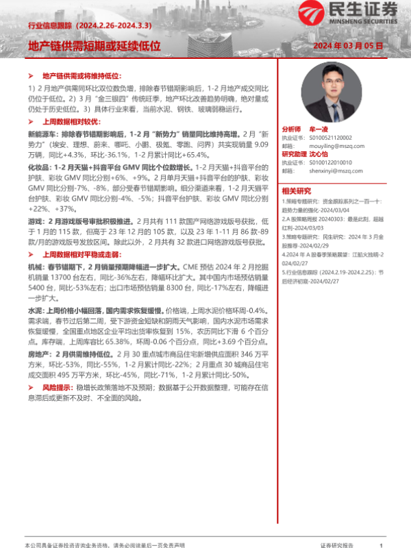 【民生证券】【20240305】行业信息跟踪:地产链供需短期或延续低位-24页 行业研究