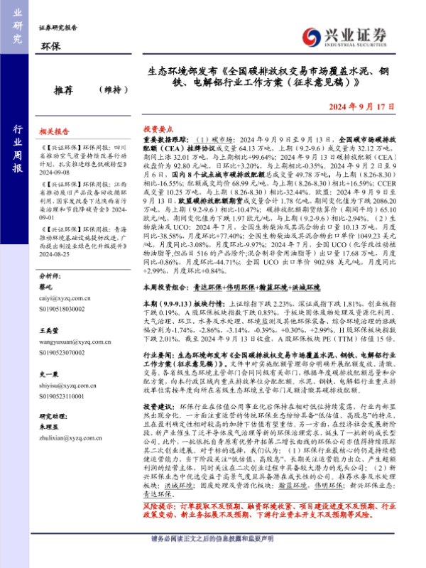 【兴业证券】【20240917】环保行业:生态环境部发布《全国碳排放权交易市场覆盖水泥、钢铁、电解铝行业工作方案(征求意见稿)》-10页 政策文件