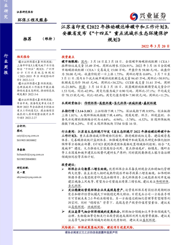【兴业证券】【20220320】环保工程及服务行业周报:江苏省印发《2022年推动碳达峰碳中和工作计划》,安徽省发布《“十四五”重点流域水生态环境保护规划》-9页 行业研究