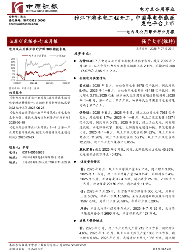 【中原证券】【202507】电力及公用事业行业月报:雅江下游水电工程开工,中国华电新能源发电平台上市-19页 证券期货研究报告