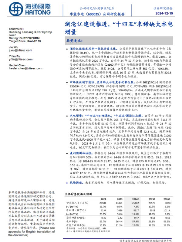 【海通国际】【20241219】华能水电(600025)公司研究报告:澜沧江建设推进,“十四五”末稀缺大水电增量-12页 行业研究