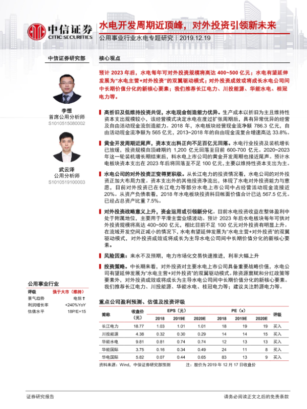 【中信证券】【20191219】公用事业行业水电专题研究:水电开发周期近顶峰,对外投资引领新未来-14页 行业研究