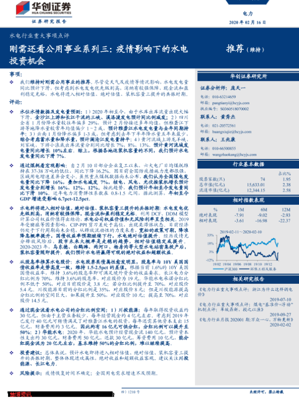 【华创证券】【20200216】水电行业重大事项点评:疫情影响下的水电投资机会-4页 行业研究