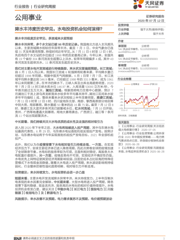 【天风证券】【20200712】公用事业行业研究周报:降水丰沛度历史罕见,水电投资机会如何演绎?-14页 行业研究