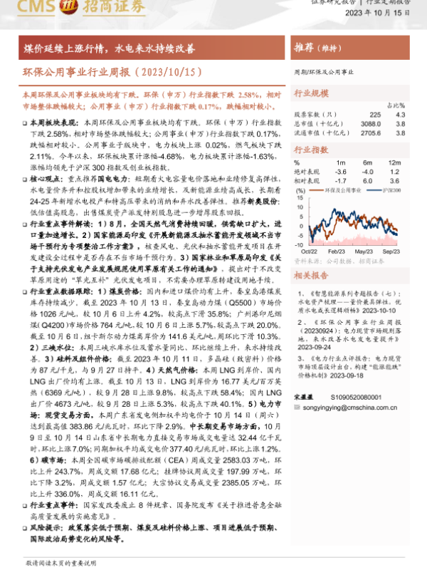 【海通证券】【20231015】环保公用事业行业周报:煤价延续上涨行情,水电来水持续改善-21页 行业研究
