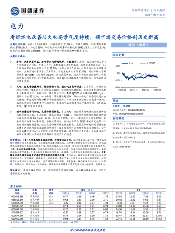 【国盛证券】【20230820】电力行业周报:看好水电改善与火电高景气度持续,碳市场交易价格创历史新高-14页 行业研究