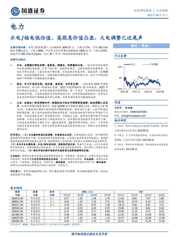 【国盛证券】【20230827】电力行业周报:水电 核电低估值、高股息价值凸显,火电调整已近尾声-14页 行业研究