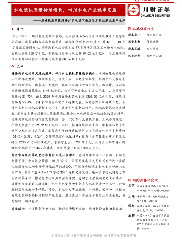 【川财证券】【20211020】川投能源参股雅砻江水电旗下杨房沟水电站建成投产点评-5页 行业研究