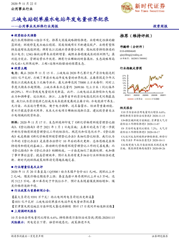 【新时代证券】【20201122】新时代证券-公用事业及环保行业周报:三峡电站创单座水电站年发电量世界纪录-18页 行业研究
