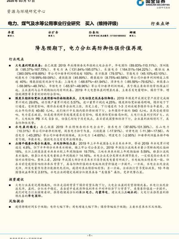 【国金证券】【20200317】电力、煤气及水等公用事业行业研究:降息预期下,电力分红高防御性强价值再现-4页 行业研究