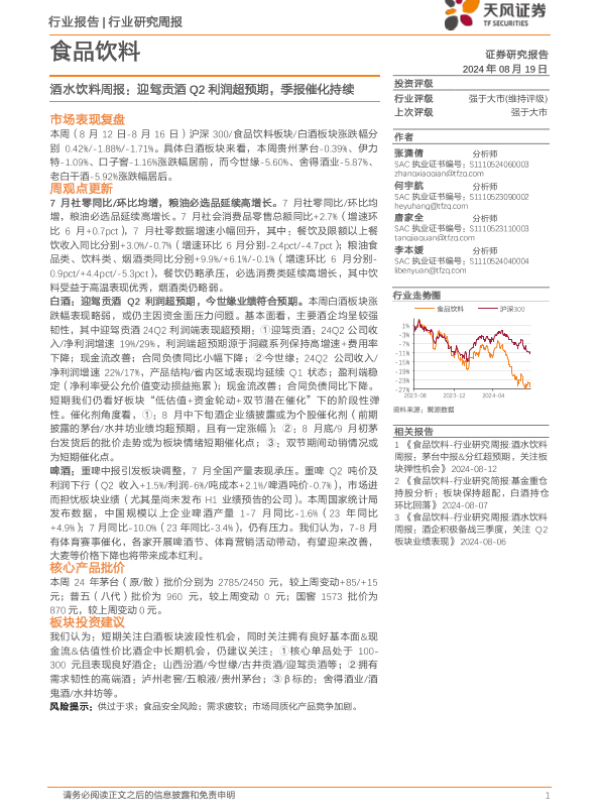 【天风证券】【20240819】20240819-天风证券-酒水饮料周报:迎驾贡酒Q2利润超预期,季报催化持续-14页 行业研究
