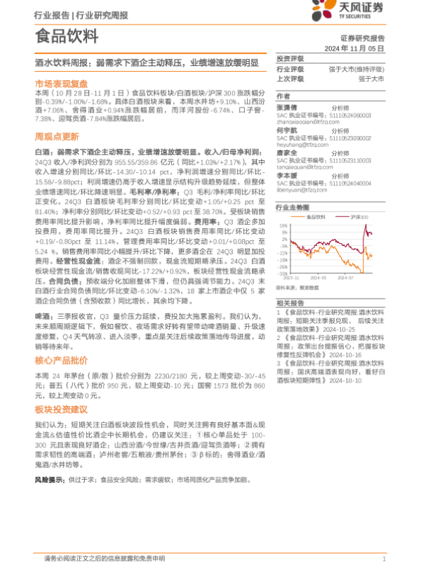【天风证券】【20241105】20241105-天风证券-酒水饮料周报:弱需求下酒企主动释压,业绩增速放缓明显-13页 行业研究
