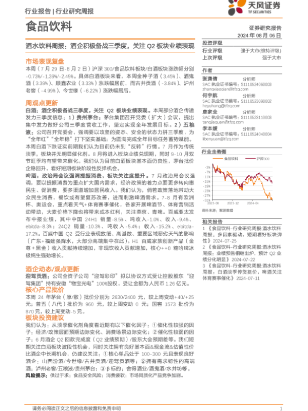 【天风证券】【20240806】食品饮料行业酒水饮料周报:酒企积极备战三季度,关注Q2板块业绩表现-14页 行业研究
