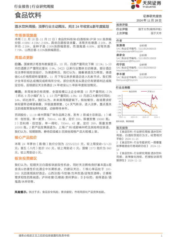 【天风证券】【20241128】20241128-天风证券-酒水饮料周报:淡季行业主动释压,关注24年收官&新年度规划-13页 行业研究