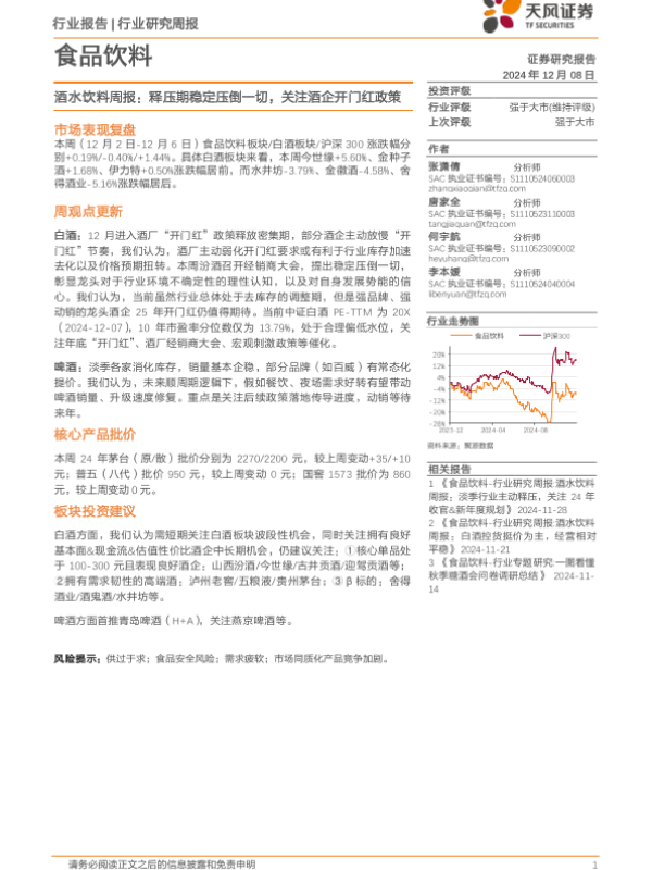 【天风证券】【20241208】食品饮料行业酒水饮料周报:释压期稳定压倒一切,关注酒企开门红政策-13页 行业研究