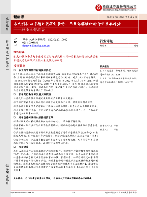 【浙商证券】【20210802】20210802-浙商证券-新能源行业点评报告:永太科技与宁德时代签订长协,凸显电解液材料行业长单趋势-3页 行业研究