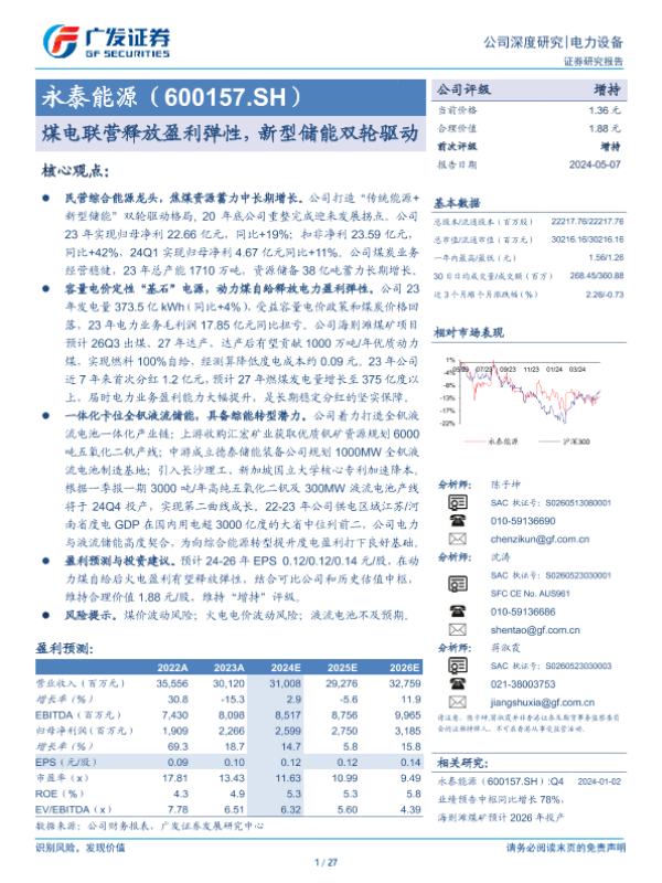 【广发证券】【20240507】永泰能源(600157)煤电联营释放盈利弹性,新型储能双轮驱动-27页 行业研究