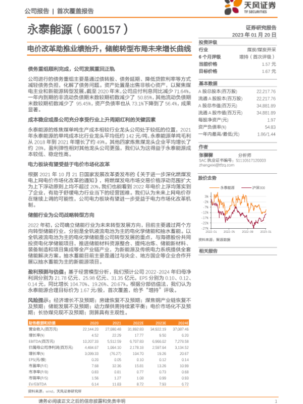 【天风证券】【20230120】20230120-天风证券-永泰能源-600157.SH-电价改革助推业绩抬升,储能转型布局未来增长曲线-22页 行业研究