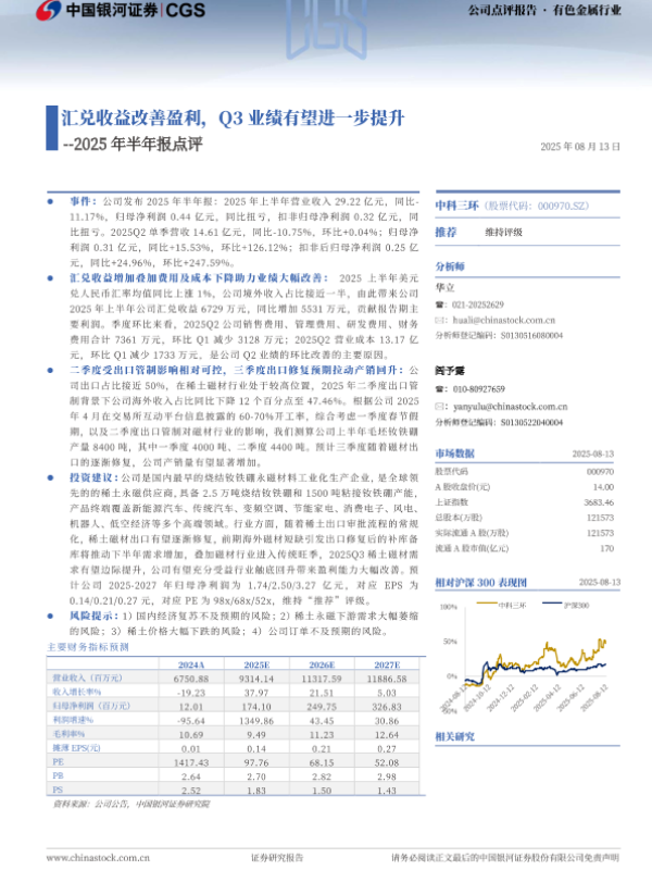 【银河证券】【20250813】中科三环(000970.SZ)2025年半年报点评:汇兑收益改善盈利,Q3业绩有望进一步提升-3页 公司研究